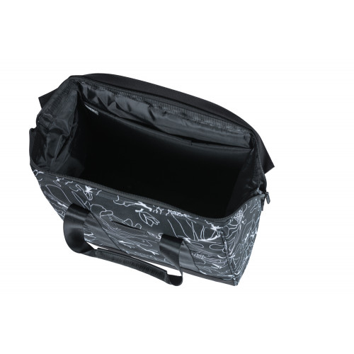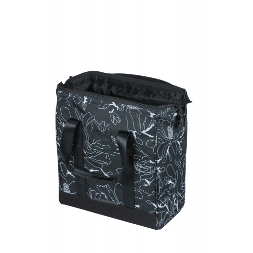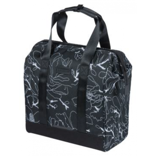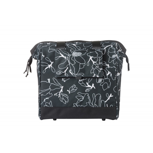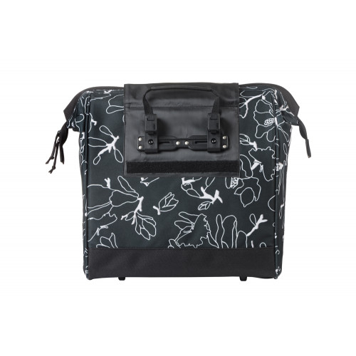 Basil Grand Flower fietsshopper, waterafstotend 600D polyester, groot hoofdvak met gepolsterd (laptop)vak, stabiele tas, met voetjes, zgn dokterssluiting, met regenwerende afwerking, handgrepen met comfortgrip, Hook On-system, ton sur ton reflectie, 23L,zwart
