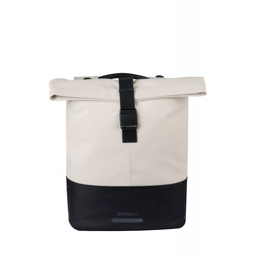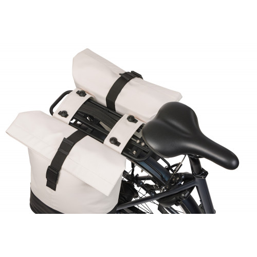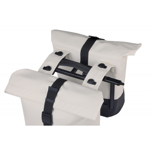 Dubbele fietstas, MIK systeemdragers/dragerplaten, incl. voorgemont. MIK Adapterplate 2.0 (70173), 28-32L, gerecycled PET – vegan leather, waterkerende vouwsluiting met gesp, geschikt voor Basil afstandhouder, klittenbandstraps, reflectie, gebroken wit/zwart