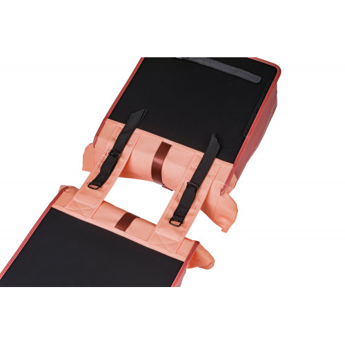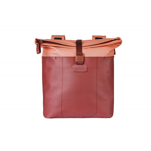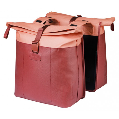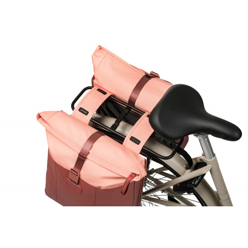 Dubbele fietstas, Universal Bridge (geschikt voor MIK en Racktime platen), 28-35L, gerecycled PET, hoofdvak waterdicht, waterkerende vouwsluiting met gesp, buitenvakken, banden met klittenband, reflectie, reparatierits, bordeaux/roze
