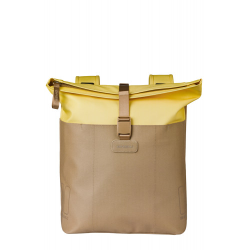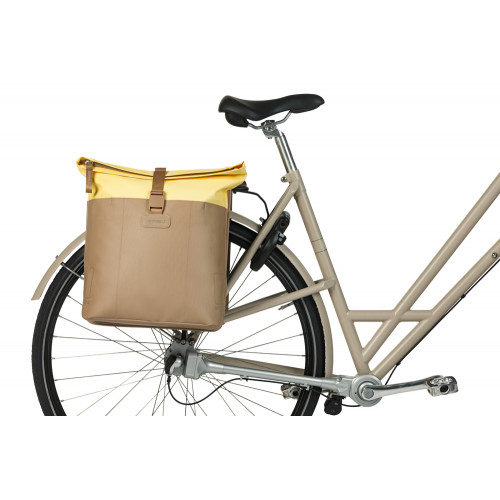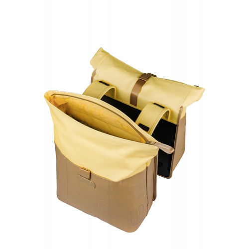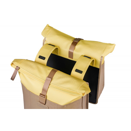 Dubbele fietstas, Universal Bridge (geschikt voor MIK en Racktime platen), 28-35L, gerecycled PET, hoofdvak waterdicht, waterkerende vouwsluiting met gesp, buitenvakken, banden met klittenband, reflectie, reparatierits, zand/geel