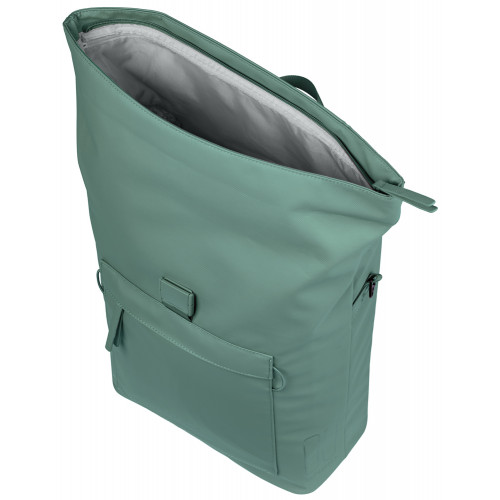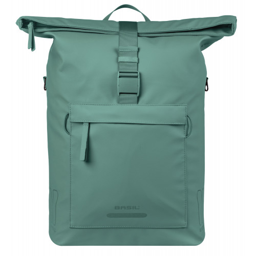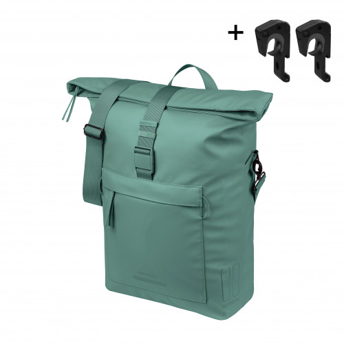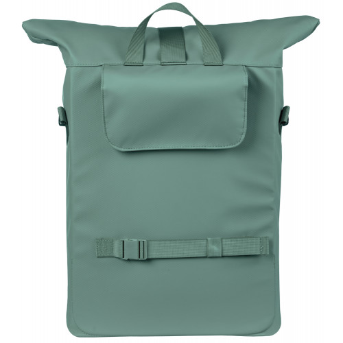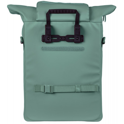 Fietsschoudertas, MIK Hooks, 17L, gerecycled PET, waterdicht hoofdvak, waterkerende vouwsluiting met gesp, binnen- en buitenvakken, laptopvak 16 inch, afneembare schouderband, helmbevestiging, handgreep, reflectie, reparatierits, zilvergroen