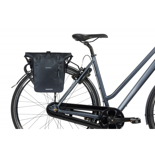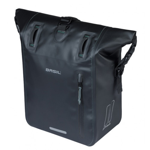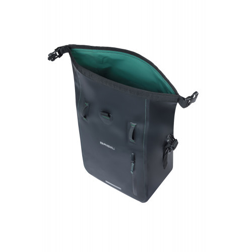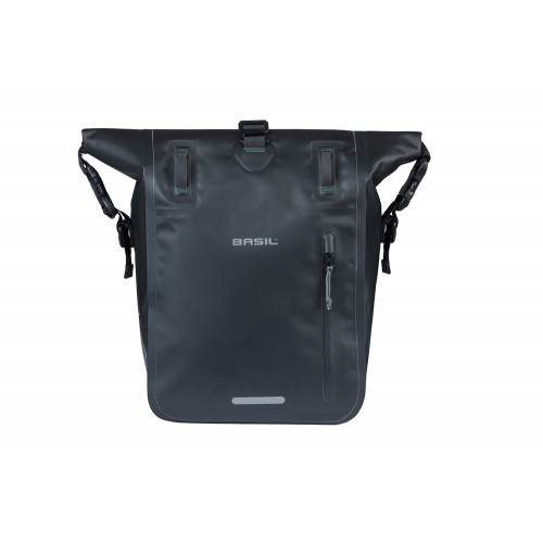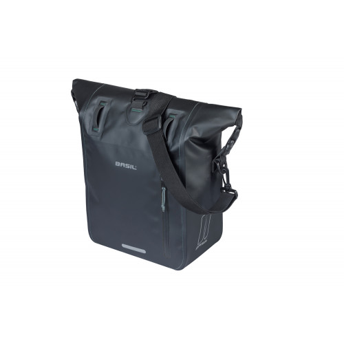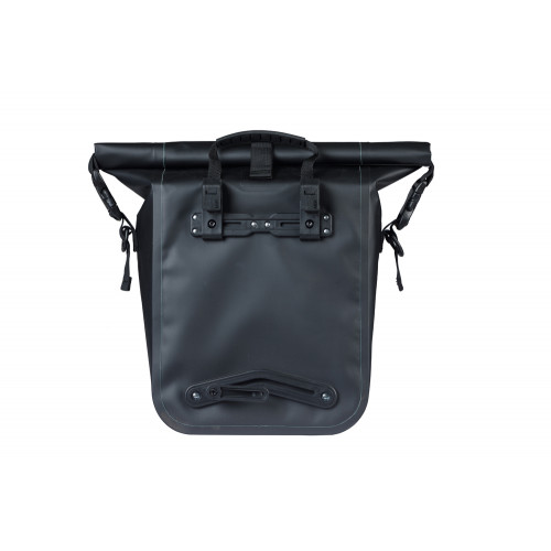 Enkele fietstas M, MIK Hooks, 12-15L, tarpaulin, waterdicht (IPX3), roltopsluiting met haak, extra gespen aan zijkant, buitenritsvak, mesh binnenvakken, lussen voor helmbevest., incl. afneembare schouderband, contrastvoering, reflectie, zwart