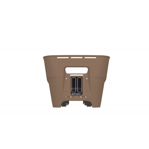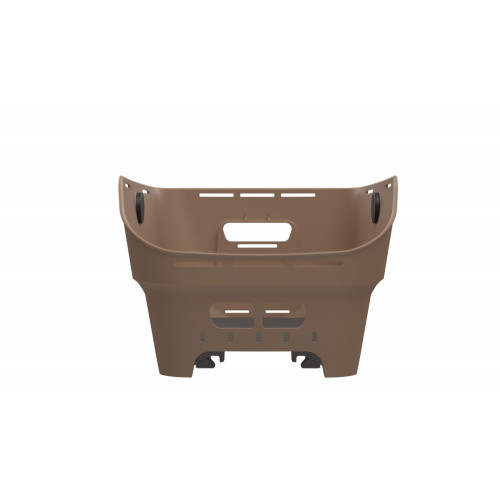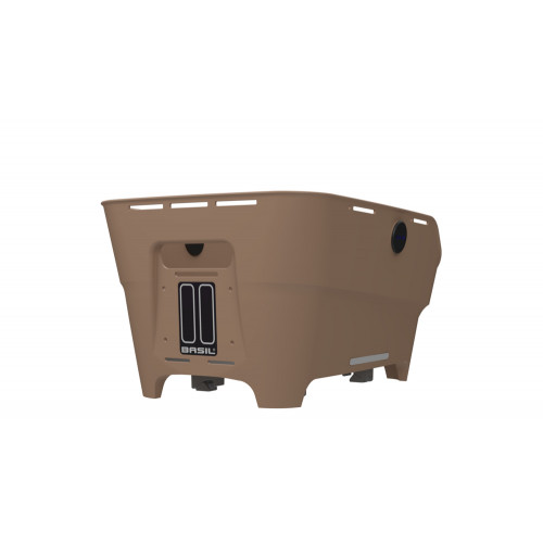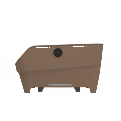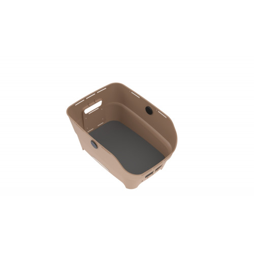 Achtermand, WSL-systeem, past op dragers met verhoogde voor-/achterkant, geschikt voor E-bikes met accu in drager, 46×35×25 cm, 1,5 kg, gerecycled kunststof, afgeschuind, in lengterichting op bagagedrager, afneembare bagageband, reflectie, zand