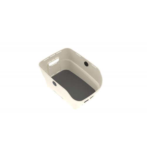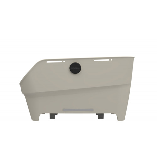 Achtermand, WSL-systeem, past op dragers met verhoogde voor-/achterkant, geschikt voor E-bikes met accu in drager, 46×35×25 cm, 1,5 kg, gerecycled kunststof, afgeschuind, in lengterichting op bagagedrager, afneembare bagageband, reflectie, gebroken wit