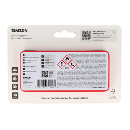 De enige echte originele Simson Reparatiedoos Normaal. Deze reparatiedoos is handig voor het repareren van vrijwel iedere traditionele fietsband zowel thuis als onderweg. Volg bij het plakken van de band de bijgeleverde instructies. De inhoud van de Simson Reparatiedoos Normaal is goed voor 12 plakbeurten.