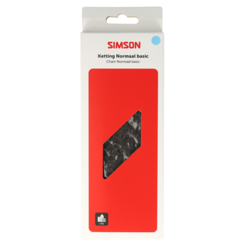 De Simson Ketting Normaal is een fietsketting geschikt voor stadsfietsen zonder versnelling en fietsen met een naafversnelling van SACHS of Sturmey Archer. Deze ketting heeft 112 schakels en een maat van 1/2 "x 1/8". De ketting is op maat te maken met behulp van een Simson kettingpons. Leg de ketting over de tandwielen en sluit de uiteinden van de ketting aan elkaar door de bijgeleverde verbindingsschakel vast te klikken.