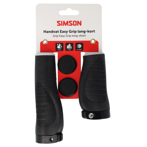 Ga voor comfort en veiligheid met de Simson Handvatten Easy Grip. De speciaal ontworpen handvatten biedt u goede grip en comfort tijdens uw fietstocht. Met de aluminium buitenklem worden de handvatten stevig en eenvoudig aan het stuur bevestigd. De handvatten zijn gemaakt van hoogwaardig en stevig materiaal. De handpalmresten zorgen voor comfort en een goede grip. De Simson handvatten zijn te verkrijgen in de variant van twee lange handvatten van 130mm of in de variant van één lang handvat van 130mm en een korte handvat van 95mm.