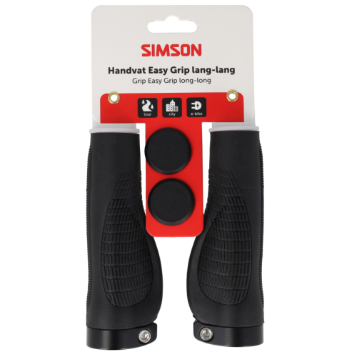 Ga voor comfort en veiligheid met de Simson Handvatten Easy Grip. De speciaal ontworpen handvatten biedt u goede grip en comfort tijdens uw fietstocht. Met de aluminium buitenklem worden de handvatten stevig en eenvoudig aan het stuur bevestigd. De handvatten zijn gemaakt van hoogwaardig en stevig materiaal. De handpalmresten zorgen voor comfort en een goede grip. De Simson handvatten zijn te verkrijgen in de variant van twee lange handvatten van 130mm of in de variant van één lang handvat van 130mm en een korte handvat van 95mm.