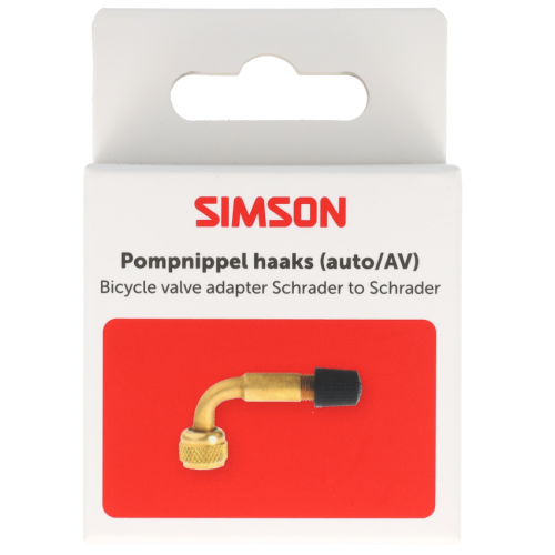 Deze Simson haakse pompnippel bied de oplossing voor moeilijk bereikbare autoventielen van bijvoorbeeld een kinderwagenband, een skelterband, een rolstoel of een kruiwagenband. Draai de Simson pompnippel op het autoventiel waarna de band opgepompt kan worden met een pomp die geschikt is voor autobanden. Verwijder na het oppompen de pompnippel van het ventiel.