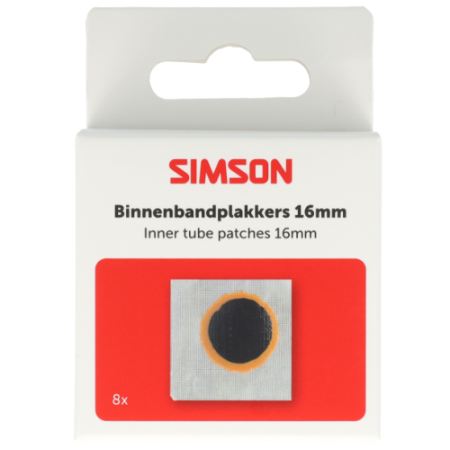 De inhoud bestaat uit 8 stuks binnenbandpleisters van 16mm. Te gebruiken in combinatie met de Simson Solutie.