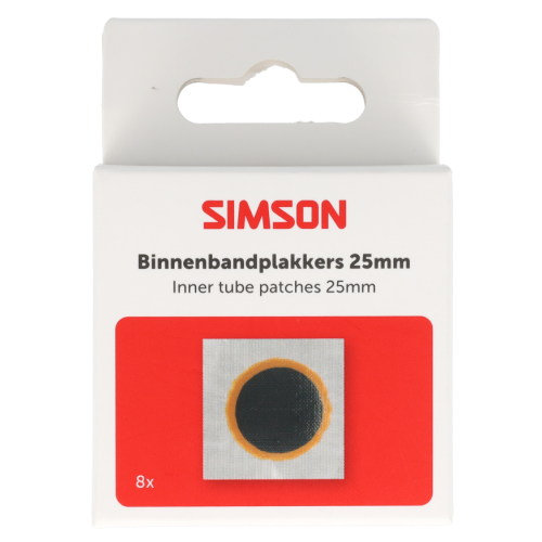 Simson Binnenbandpleisters 25mm. Met deze vulkanisatie pleisters is een lekke binnenband zo geplakt. Geschikt voor vrijwel alle binnenbanden. Ook geschikt ter aanvulling van de gebruikte plakkers uit de Simson Reparatiedoos. De inhoud bestaat uit 8 stuks binnenbandpleisters van 25mm. Te gebruiken in combinatie met de Simson Solutie.