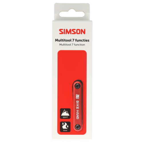Deze Simson multitool is een fietsgereedschap setje met de belangrijkste gereedschappen bij pech onderweg. De Simson multitool bevat een kruiskop schroevendraaier, een platte schroevendraaier en 5 maten inbussleutels (2, 3, 4, 5 en 6 mm). Door zijn compacte formaat en lichte gewicht is deze multitool zeer handig voor onderweg.