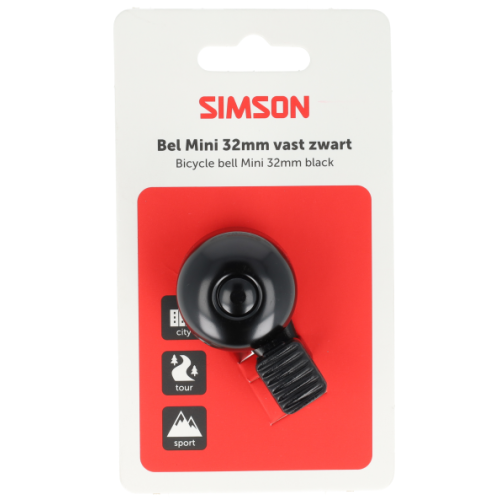 De Simson fietsbel Mini 32mm, met een vaste kunststof bevestiging, kan met behulp van een kruiskopschroevendraaier worden gemonteerd op het stuur. De zwarte Simson bel heeft een diameter van 32mm en is gemaakt van aluminium in combinatie met een hoogwaardige kunststof. Dit geeft de bel een sportieve uitstraling en een helder geluid.