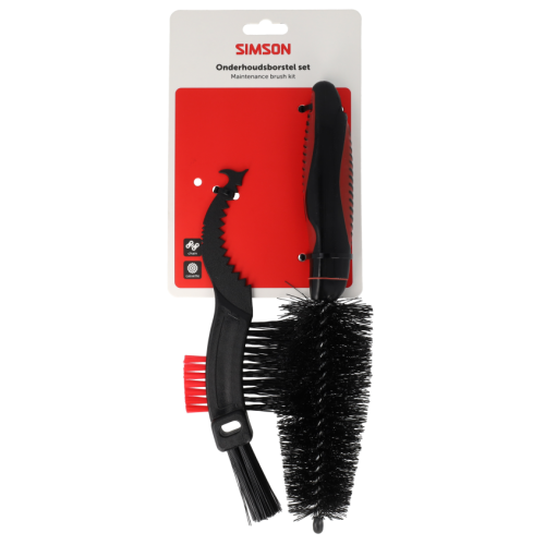 Simson Onderhoudsborstel set om grondig kettingen, kettingbladen, derailleurs en remmen schoon te maken. De set bestaat uit twee verschillende borstels. Reinig met de multiborstel eenvoudig de fietsketting en het versnellingssysteem. Haal met de gekartelde kunststof kant het grove vuil tussen de tandwielen, waarna met de borstel het losgemaakte vuil kan worden verwijderd.