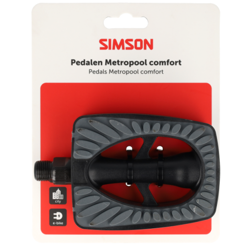De Simson Pedalen Metropool comfort zijn geschikt voor vrijwel iedere fiets, maar met name populair op stads-, tour-, oma en E-bike fietsen. De comfortabele pedalen zijn voorzien van reflectoren en zorgen met een kunststof antislip laag voor extra grip onder alle omstandigheden.