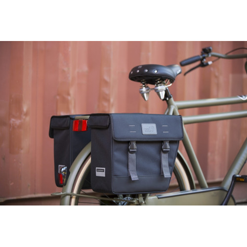 De Origin Double is een stevige dubbele fietstas gemaakt van waterafstotend Polyester. Doordat de tas aan alle zijden versteviging heeft, is deze zeer geschikt als boodschappentas. Je sluit de tas met klikgespen en de tas heeft reflectie. Daarnaast heeft dit model 1 afgeschuinde kant. Daardoor trap je niet met je voeten tegen de tas aan.