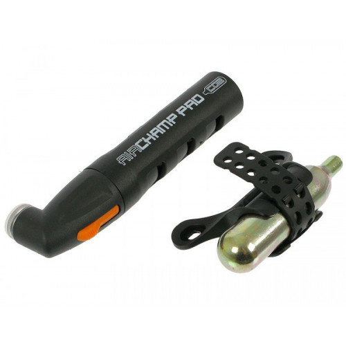 De Airchamp Pro CO2 kan met één hand worden gebruikt en is goed doseerbaar. De bedieningsvergrendeling voorkomt dat de pomp onbedoeld gebruikt wordt. Dankzij het omkeerbare ventielinzetstuk past hij op alle ventielen. De luchtpomp is geschikt voor 16 grams-CO2-patronen met en zonder schroefdraad. Inclusief klemhouder voor montage onder de bidonhouder en een 16 grams CO2-patroon.