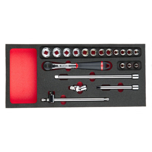 3/8“ ratel met 15 verschillende 6-kant doppen plus 2 verlengstukken en een universeel cardangewricht