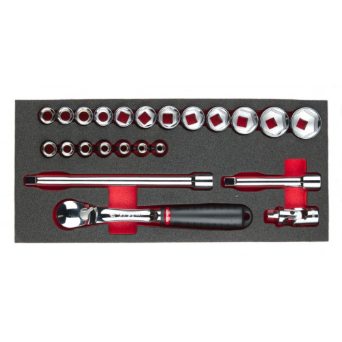 1/2“ ratel met 19 verschillende 6-kant doppen plus 2 verlengstukken en een universeel cardangewricht