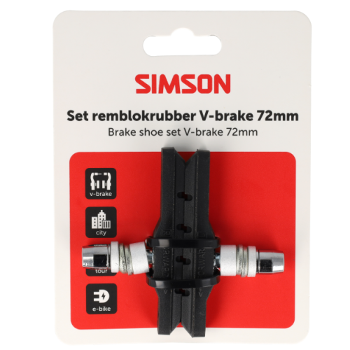 De Simson Remschoenen V-brake 72 mm zijn geschikt voor Shimano V-Brake remsystemen. De remschoenen zijn geschikt voor zowel voor- als achterrem. Draai met een inbussleutel de versleten remschoen los van de rem. Monteer de nieuwe remschoen met de inbussleutel in de juiste rijrichting, aan beide kanten even ver van de velg. De Simson Remschoenen worden geleverd per 2 stuks.