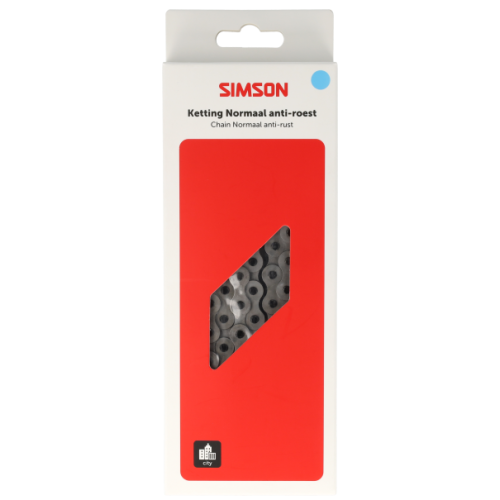 De Simson Ketting Normaal Anti-roest is een kwalitatief hoogwaardige fietsketting met een milieuvriendelijke anti-roest coating voor stadsfietsen zonder versnelling en fietsen met een naafversnelling van SACHS of Sturmey Archer. Deze ketting heeft 112 schakels en een maat van 1/2 "x 1/8". De ketting is op maat te maken door schakels te verwijderen met behulp van een Simson kettingpons. Leg de ketting over de tandwielen en sluit de uiteinden van de ketting aan elkaar door de bijgeleverde verbindingsschakel vast te klikken.