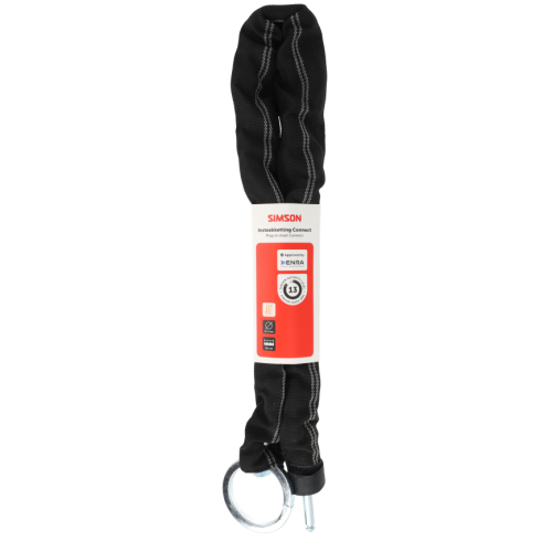 De Simson insteekketting Connect heeft een universele plug-in pin, schakels van 5,5mm gehard staal en een lengte van 90 cm. De polyester hoes is vuil en waterafstotend. De ketting heeft een SSL van 13 (van 15) en past op alle bekende meerdere merken sloten.