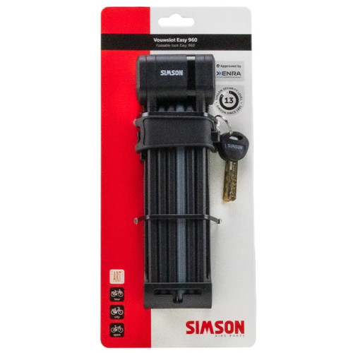 Het Simson vouwslot Easy-960 is een licht gewicht ART2 goedgekeurd vouwslot voor dagelijks gebruik en is tevens geschikt bij gebruik van sportieve fietsen. Het vouwslot heeft een Simson Security Level van 13 (van 15) en wordt inclusief handige houder geleverd. De houder kan op de bidonnokken gemonteerd worden. Mocht dat niet aanwezig zijn op de fiets, kan de houder aan de stang vastgemaakt worden met de 2 mee geleverde strips. Het Simson vouwslot 960 heeft een lengte van 260 mm en heeft flexibele scharnierpunten, hierdoor kan je je fiets makkelijk aan een paal of hek vastmaken. De gehard stalen segmenten zijn 7 mm dik. Het vouwslot wordt met 2 sleutels geleverd.